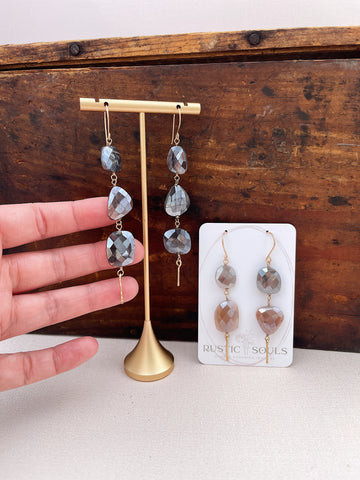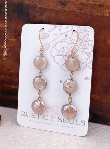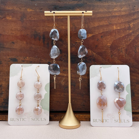 These gorgeous earrings are made with multicolored diamond coated moonstone and 14k gold fill. They add the perfect amount of drama to any outfit.