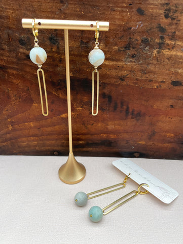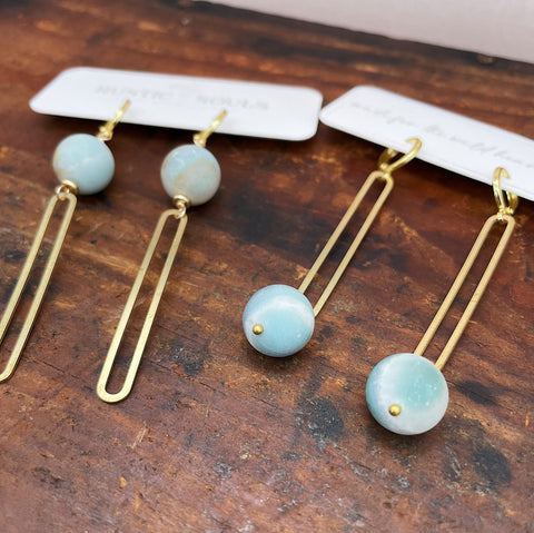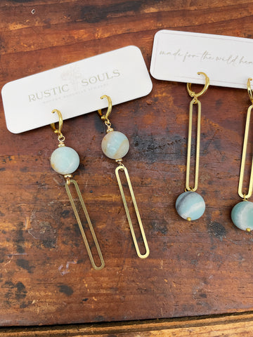 These super cute paperclip shaped dangle earrings are adorned with large amazonite stones on brass.