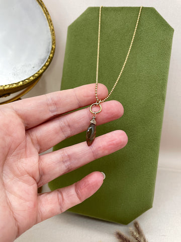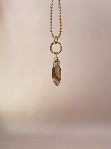 This lovely necklace is adorned with a unique andusulite stone wrapped in 14k gold fill on a 24k gold overlay ball chain. It’s a perfect piece to layer.