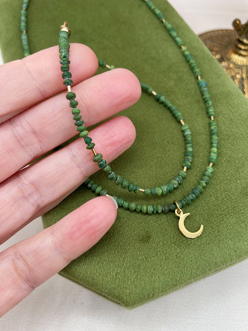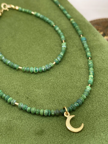 This dainty beaded jade necklace and matching bracelet is adorned with 14k gold fill accents. Listing includes both the necklace and bracelet.