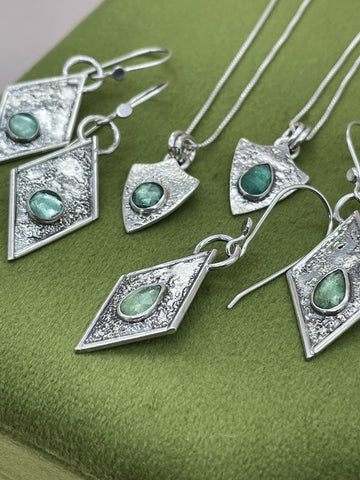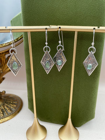 These gorgeous earrings are made with faceted kyanite stones that are set in fused sterling (with a couple chips of 14k gold mixed in) that have been shaped into a diamond.