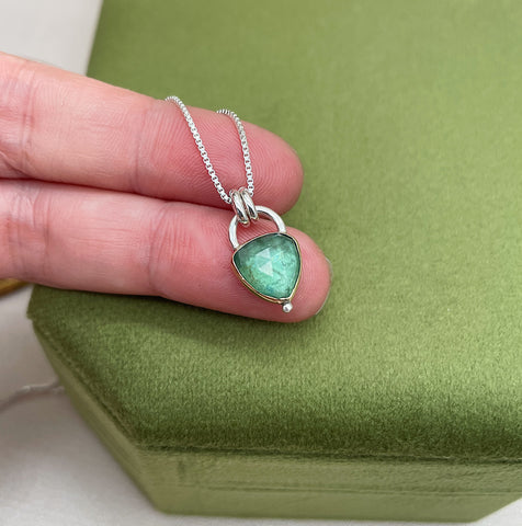 Necklace: 9mm trillion cut stone, 18 inches long chain, choose between a box chain or snake chain. Please put your choice in the comments at checkout otherwise the pendant will be shipped with a box chain.