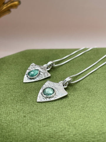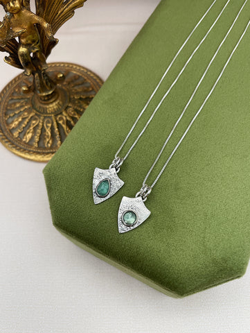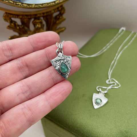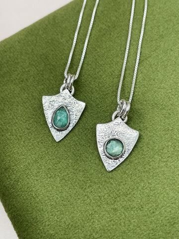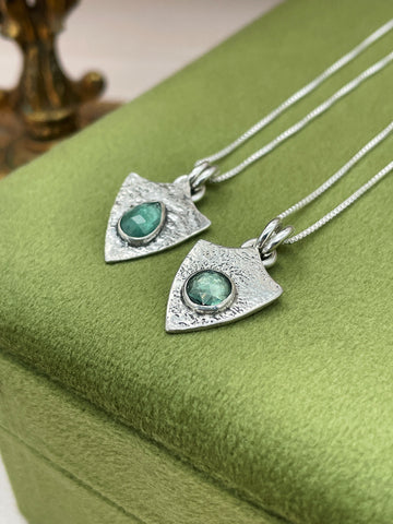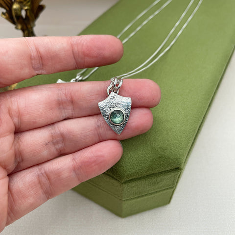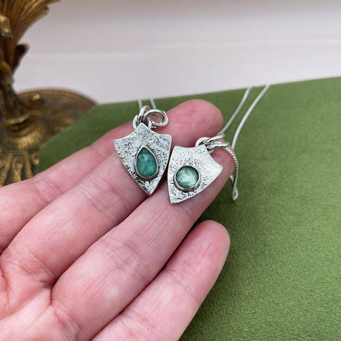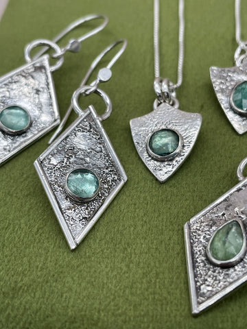 Dainty faceted kyanite stones are set in fused sterling that have been shaped into a shield. Lately I’ve been needing the reminder of the strength I carry and these pendants embody that symbolism.