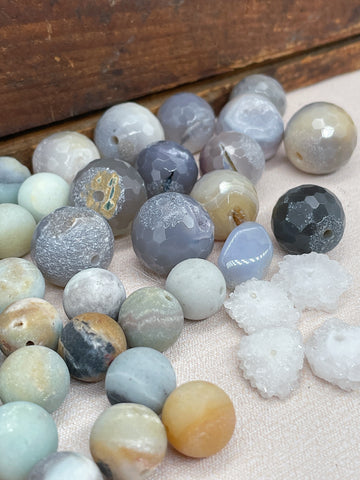 A mix of large faceted agate beads, druzy beads, and matte amazonite beads.
