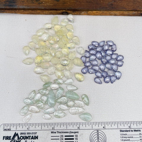 A mix of faceted pineapple quartz, faceted purple quartz and green amethyst beads
