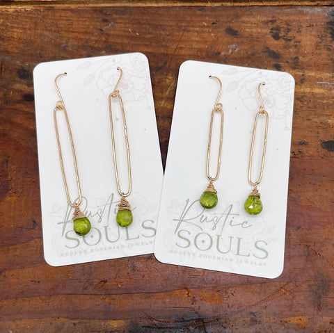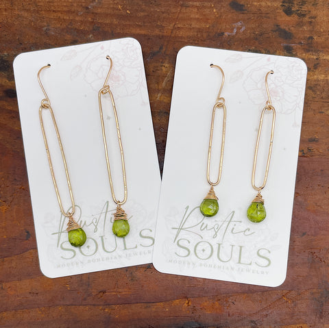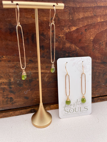 These super cute and dainty paperclip style dangle earrings are adorned with large peridot on hammered 14k gold fill.